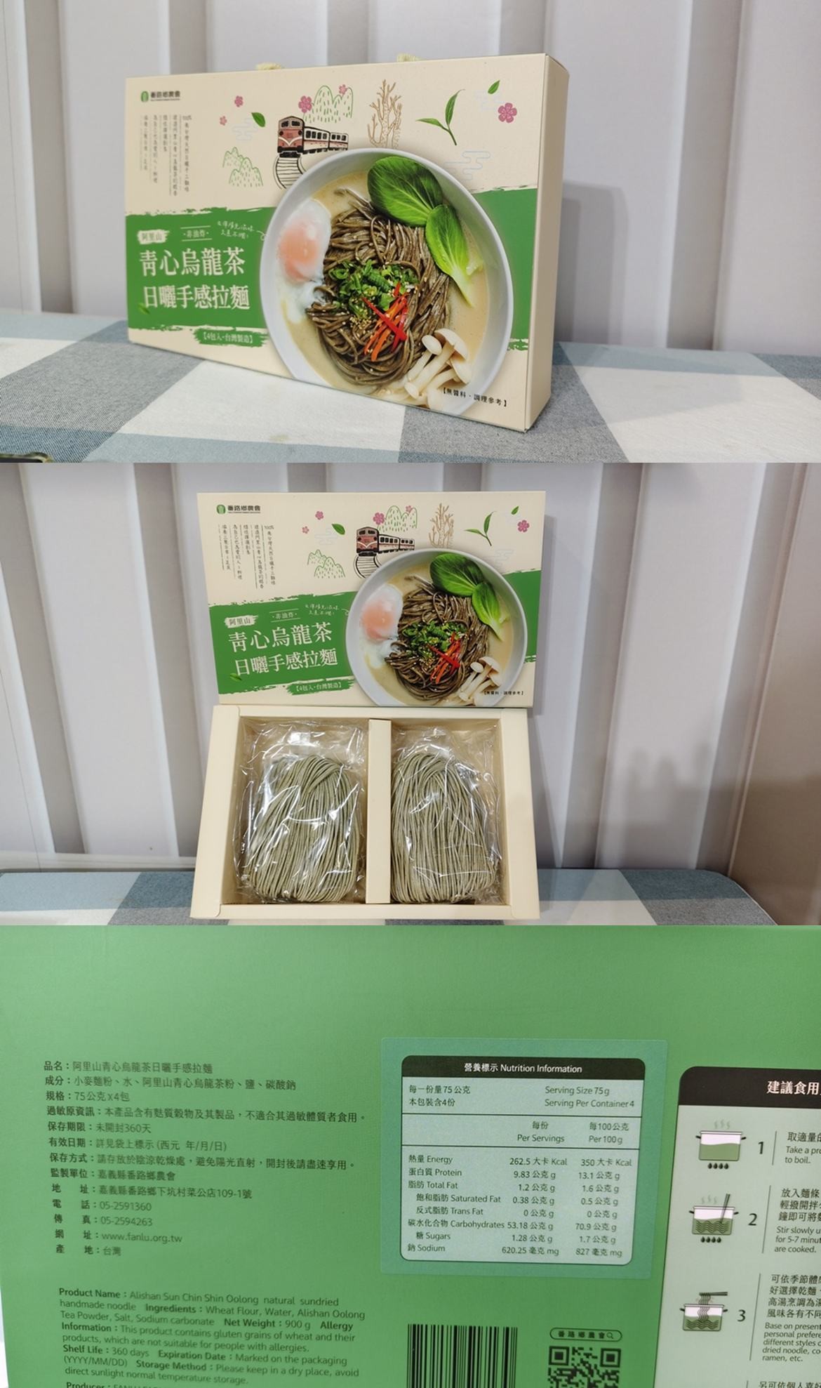 重量: (1)阿里山烏龍茶&茶油乾拌麵禮盒130公克*4包(附醬包)純素 (2)阿里山青心烏龍茶日曬手感拉麵禮盒75公克*4包/純素