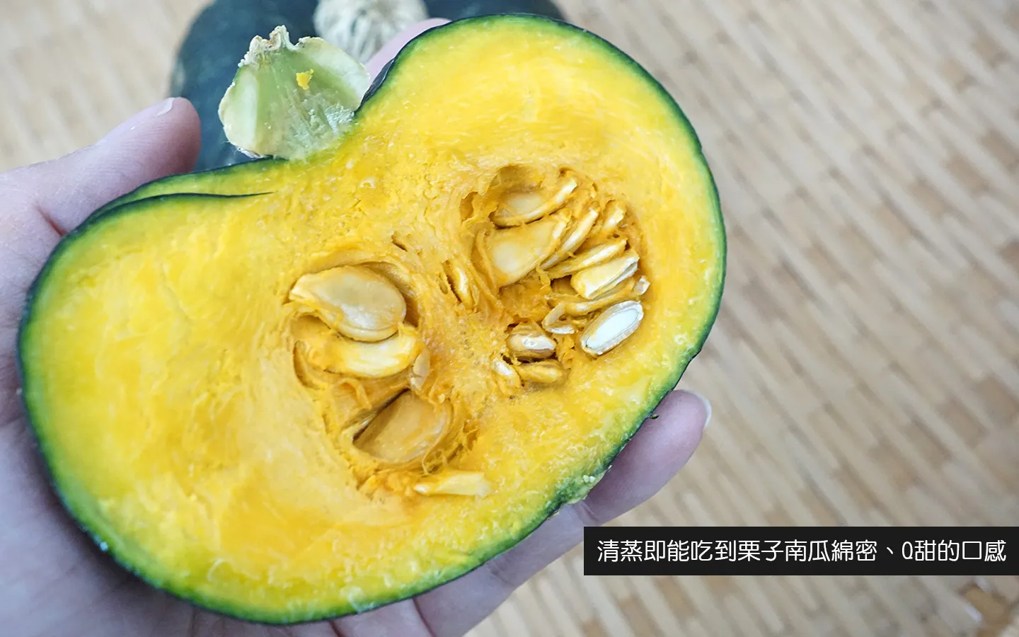 扁圓形,口味似栗子,綠色外型、Q實香甜的果肉、耐煮不易軟爛的特性、品質更勝一般南瓜,清蒸即能吃到栗子南瓜綿密、Q甜的口感絕對顛覆您對南瓜的印象!